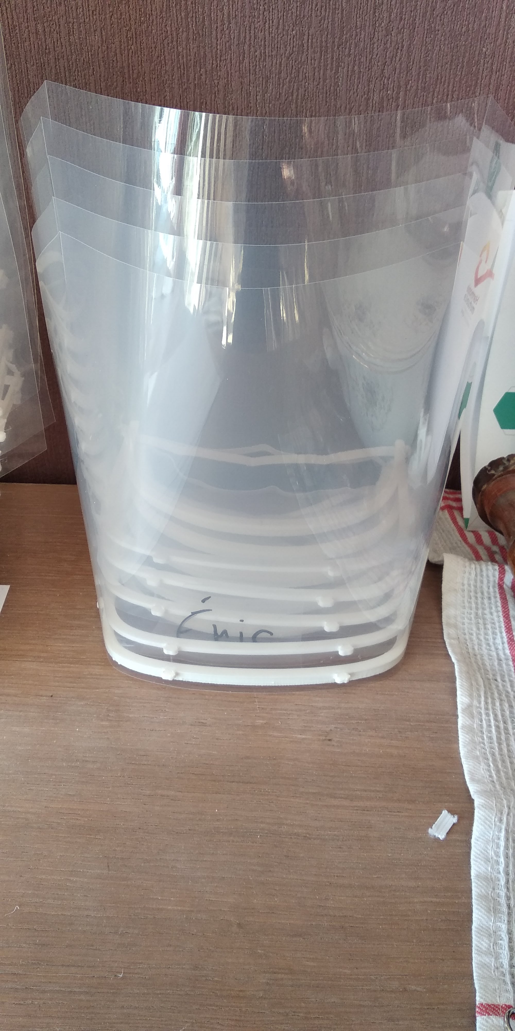 Bon, les visières, ce sont une des protections les plus connues. En fait, cela part du principe que si il n’y a vraiment pas de protection, alors juste protéger des projections, c’est mieux que rien. Et mine de rien, il y a de la demande. En deux semaines, j’en ai produit 150, qui ont déjà été données. Pour réduire les coûts de production et le temps d’impression, nous avons “remixé” le modèle de Makerbot. (lien) Celui-ci possède de meilleurs crochets à élastique, une plus grande surface de contact avec le front pour un meilleur confort, et une plus grande surface de contact avec la “vitre” de façon à avoir un meilleur maintien. Bon, en plus de ça, je rajoute un peu de mousse au niveau du front, parce qu’à la longue, je pense que ça peut être inconfortable.